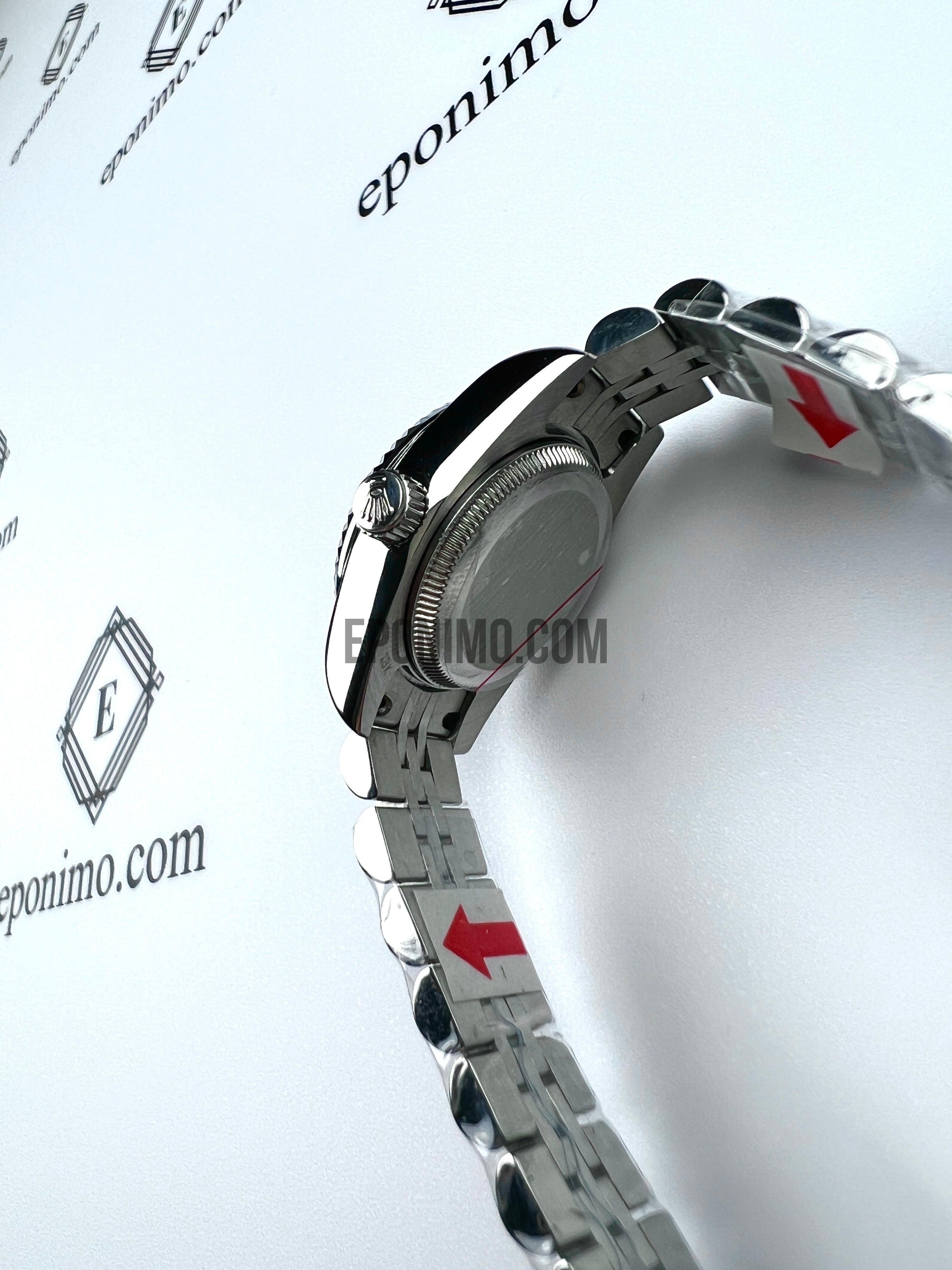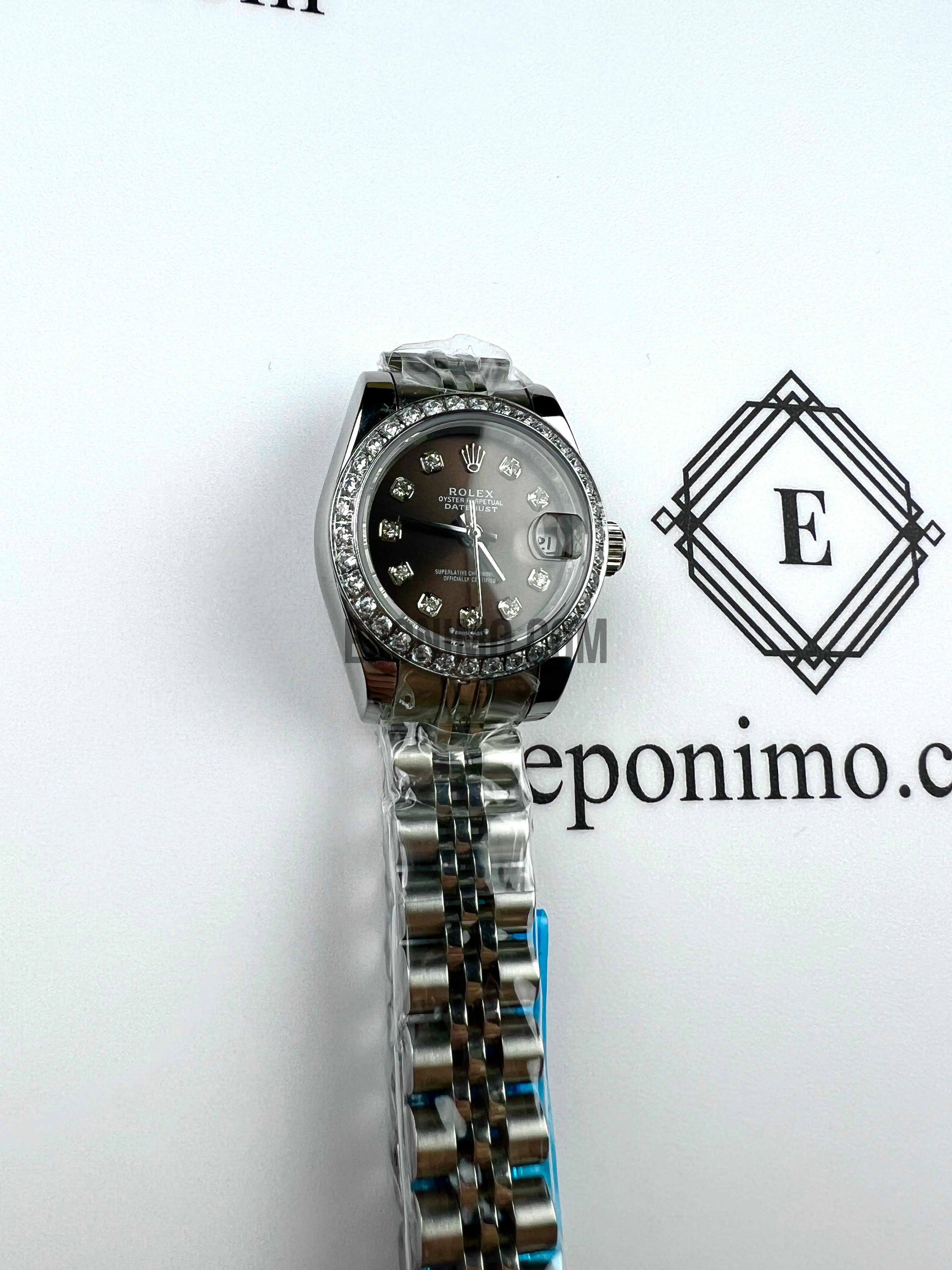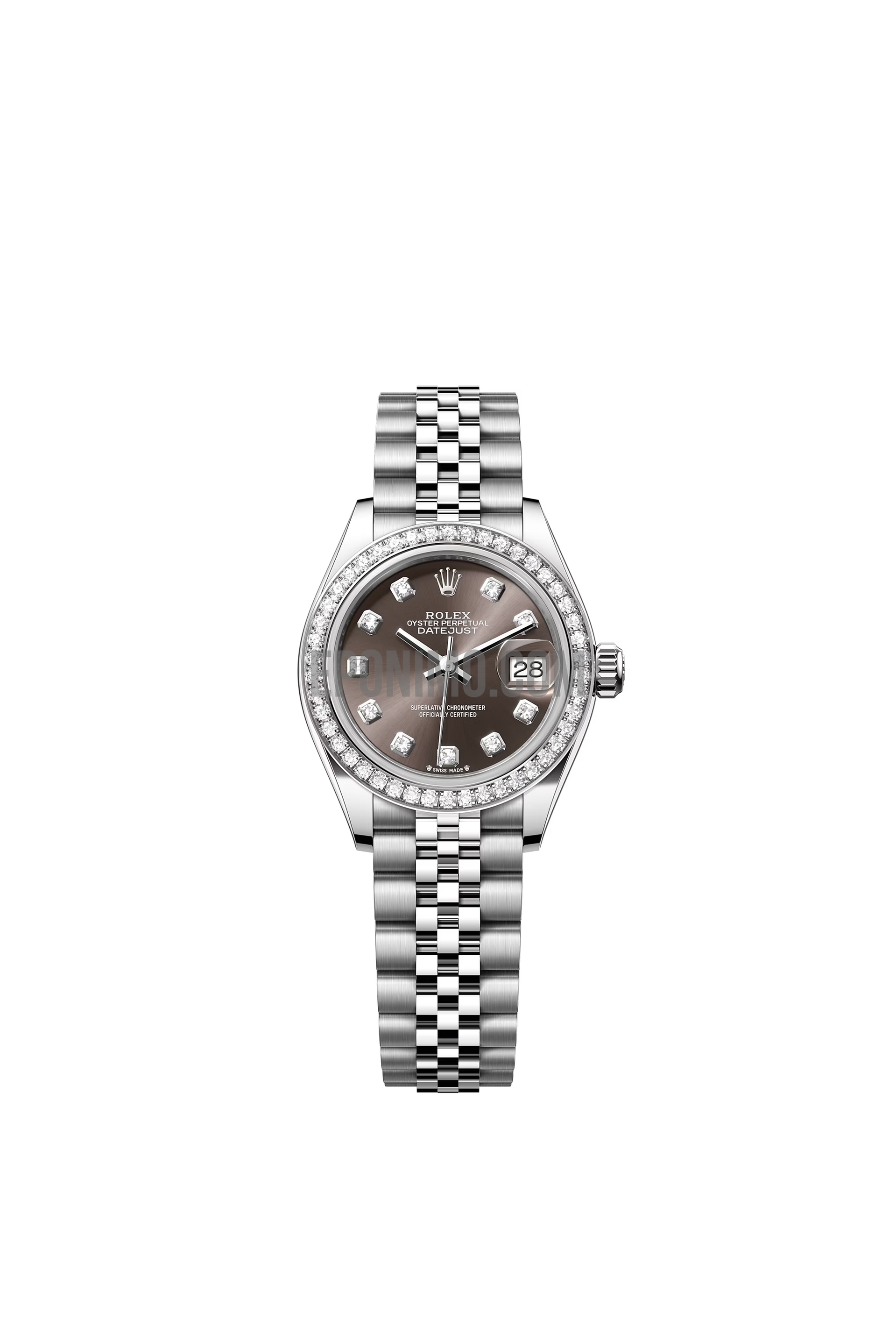 Με 28 χιλιοστά διάμετρο, γυναικείο, κατασκευασμένο εξ'ολοκλήρου από συμπαγές ανοξείδωτο ατσάλι. Φοράει αντιχαρακτικό κρύσταλλο ζαφειρίου και αυτόματο μηχανισμό. Αδιάβροχο.