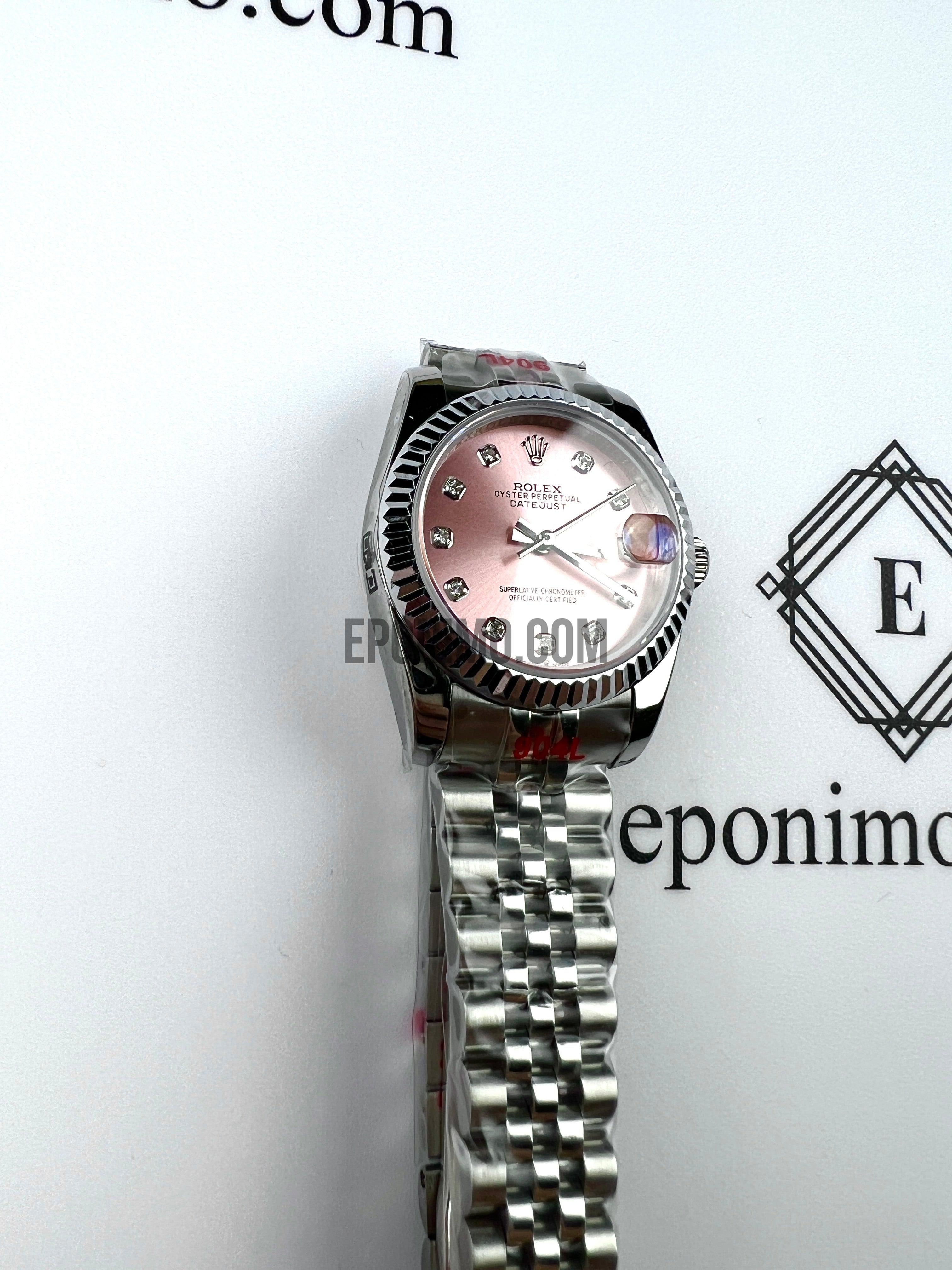 Με 31 χιλιοστά διάμετρο, γυναικείο, κατασκευασμένο εξ'ολοκλήρου από συμπαγές ανοξείδωτο ατσάλι. Φοράει αντιχαρακτικό κρύσταλλο ζαφειρίου και αυτόματο μηχανισμό. Αδιάβροχο.