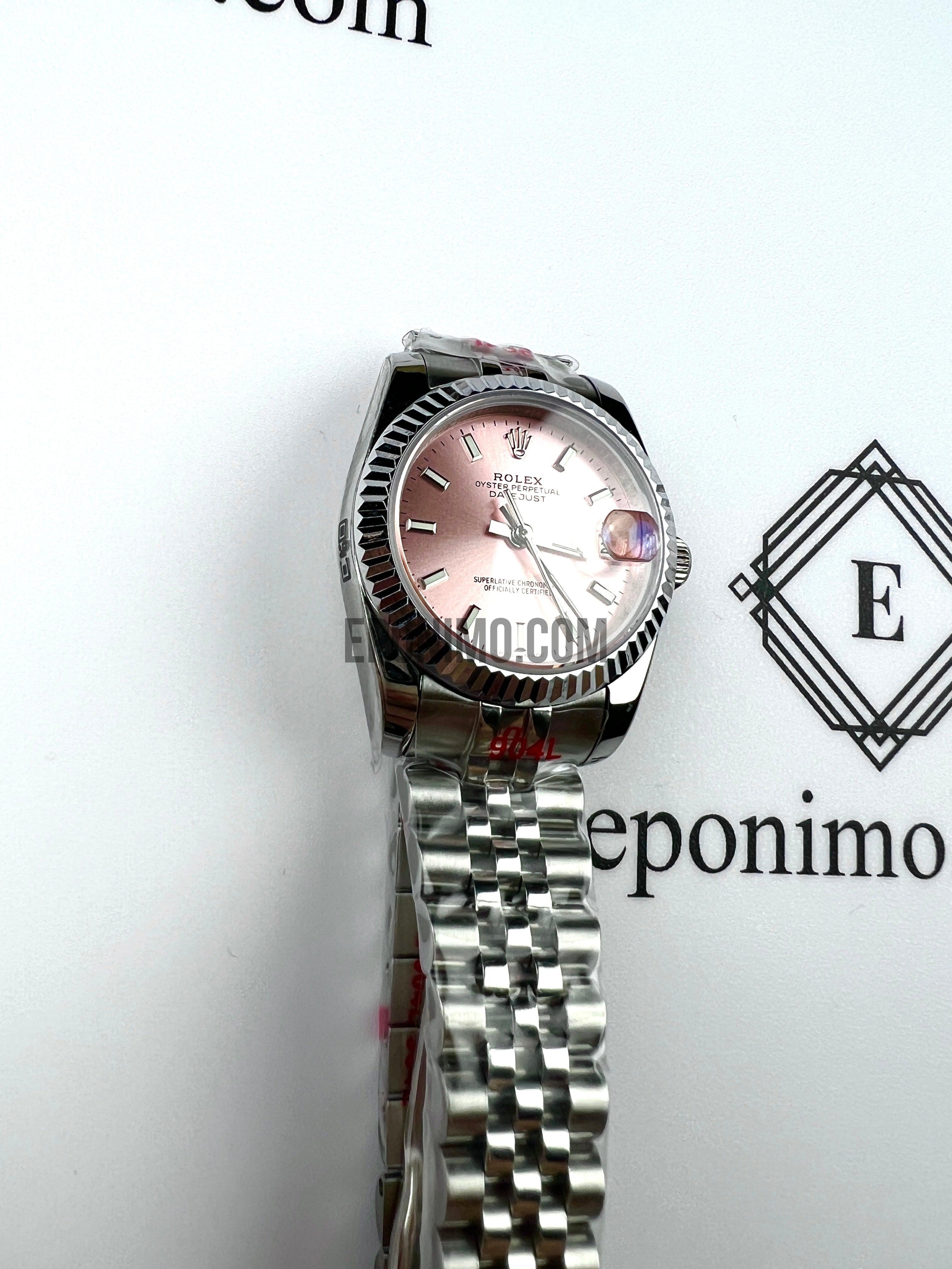 Με 31 χιλιοστά διάμετρο, γυναικείο, κατασκευασμένο εξ'ολοκλήρου από συμπαγές ανοξείδωτο ατσάλι. Φοράει αντιχαρακτικό κρύσταλλο ζαφειρίου και αυτόματο μηχανισμό. Αδιάβροχο.