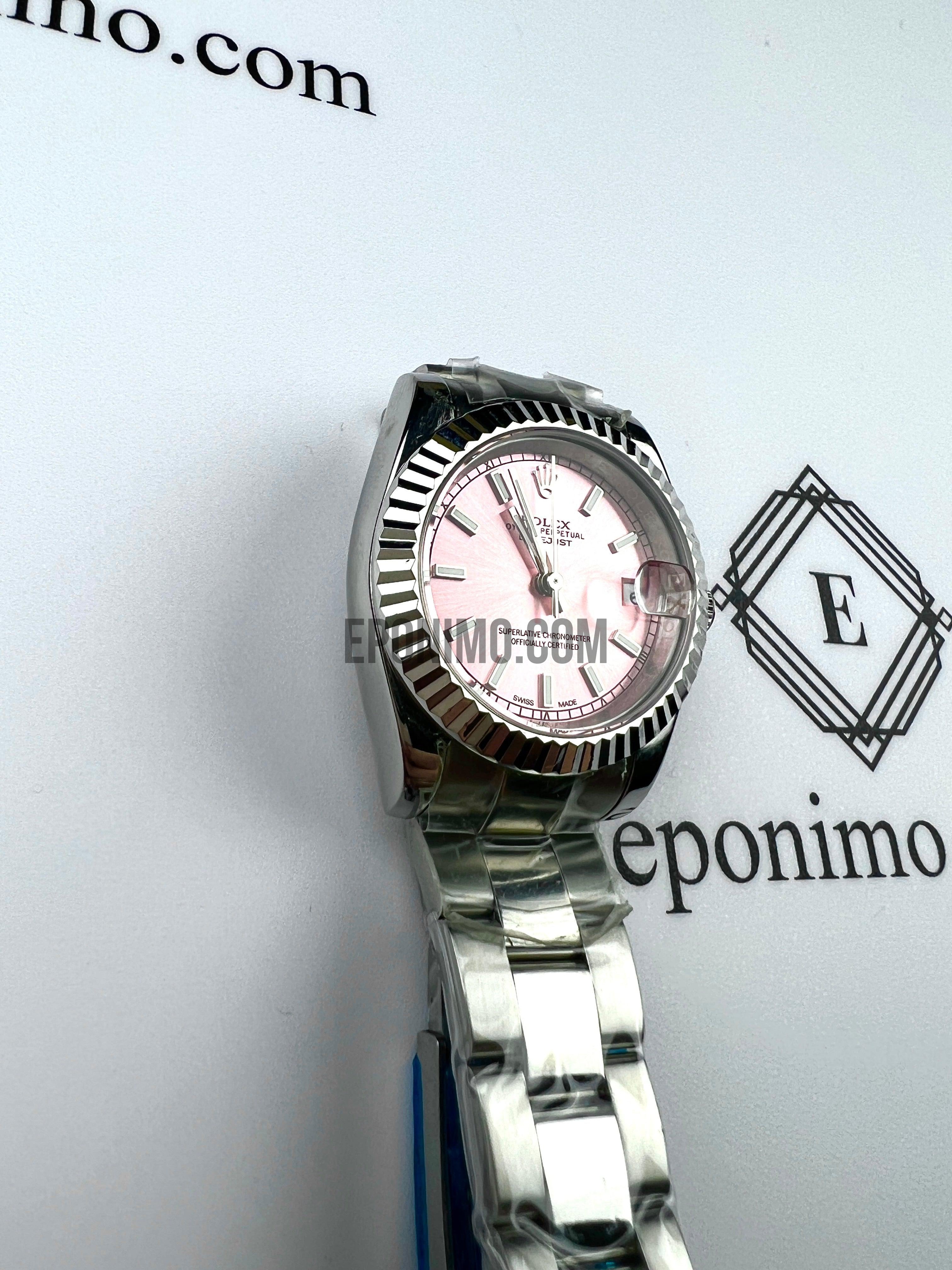 Με 31 χιλιοστά διάμετρο, γυναικείο, κατασκευασμένο εξ'ολοκλήρου από συμπαγές ανοξείδωτο ατσάλι. Φοράει αντιχαρακτικό κρύσταλλο ζαφειρίου και αυτόματο μηχανισμό. Αδιάβροχο.